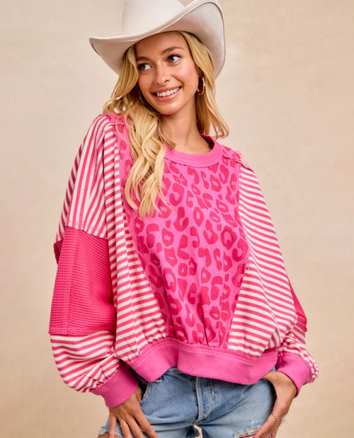 Bibi Leopard Print Top with Stripe Wavy Trim Detail