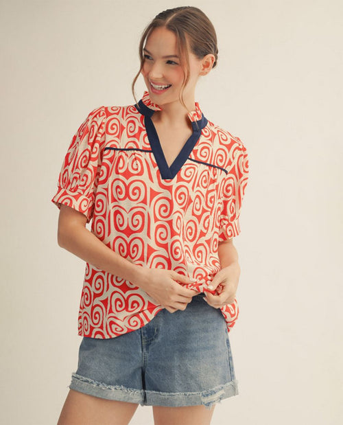 Jodifl Swirl Print Top With Ruffle Neckline Red