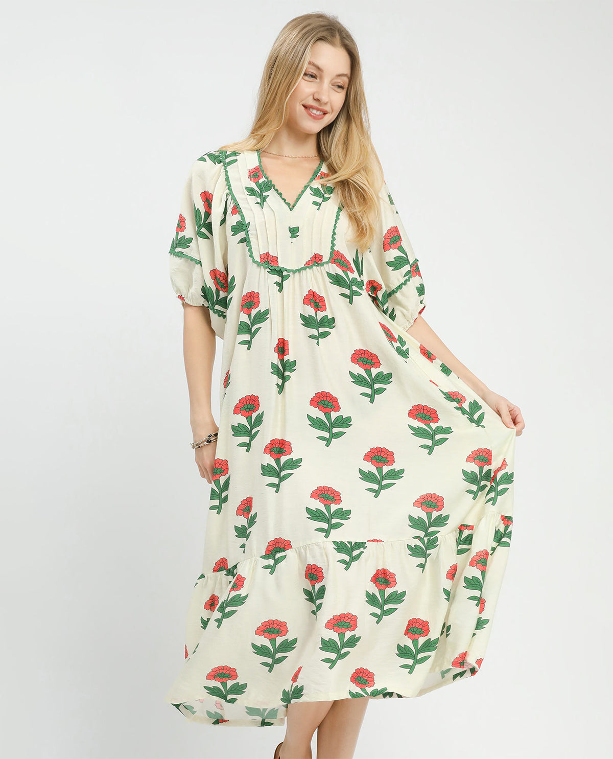 Effortlessly chic and undeniably fun, this Umgee print V-neck long dress in pink is your go-to for turning heads. The flattering V-neckline draws the eye upward while the flowing silhouette skims your curves in all the right ways. Vibrant print details add personality and movement to every step. Perfect for brunch dates, casual outings, or whenever you want to feel put-together without trying too hard. Slip it on and let the compliments roll in!
