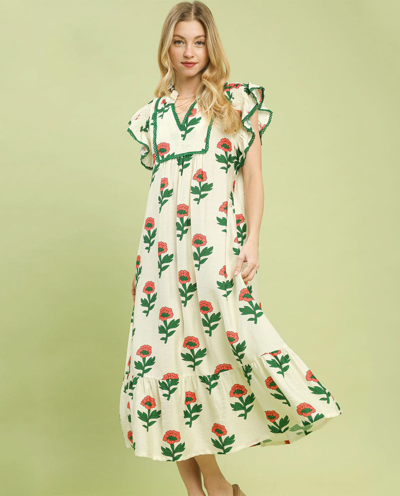 Umgee Floral Print Ruffle Neck Dress with Lace Cream