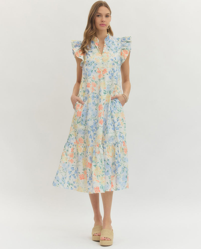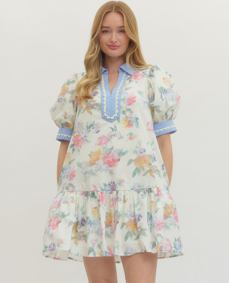 Entro Print Babydoll Dress w/Puff sleeves and High collar