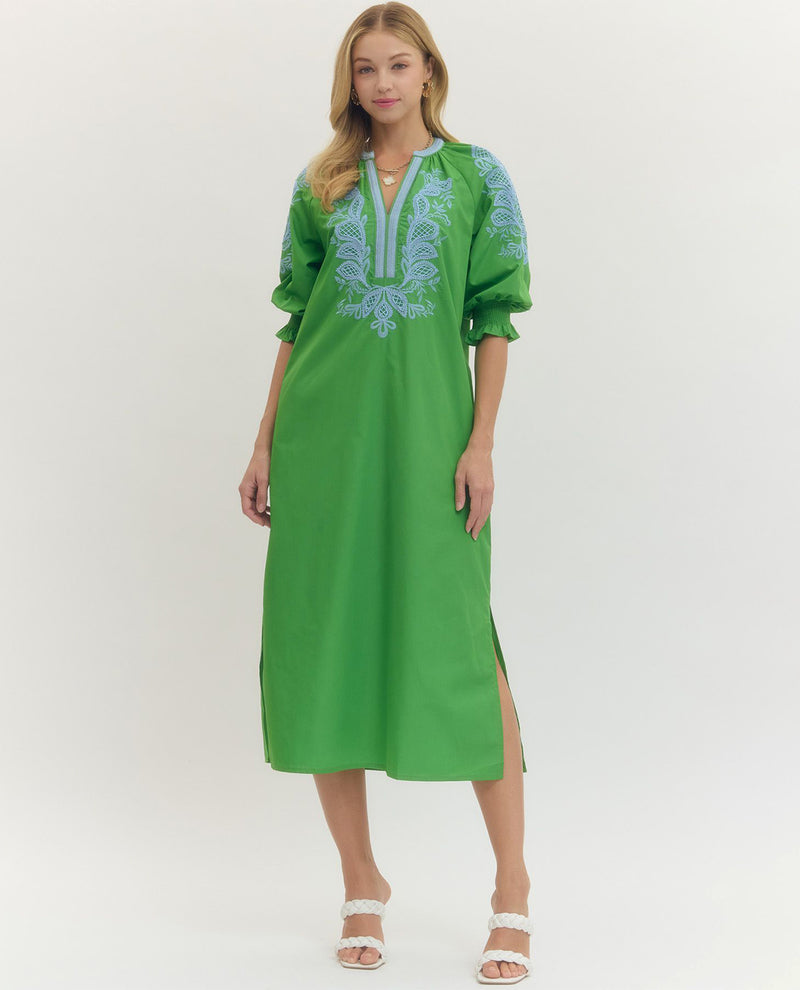 Entro 3/4 Sleeve Embroidered Dress with Tie Sleeve