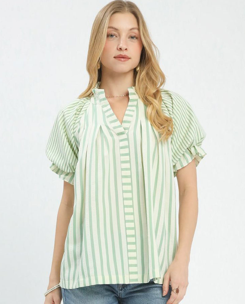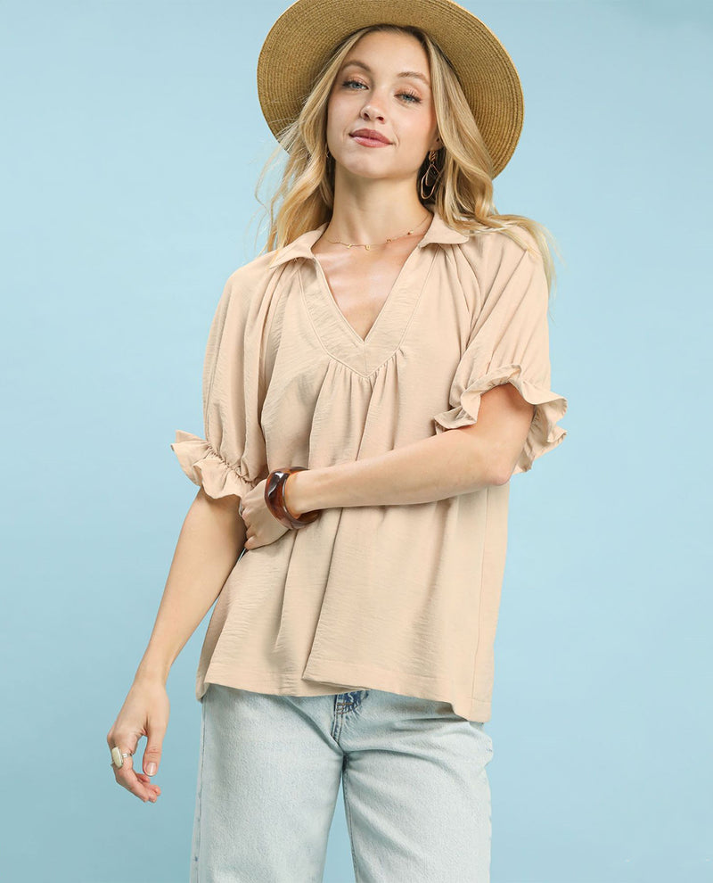 Umgee Solid V-neck Top with Short Puff Sleeves