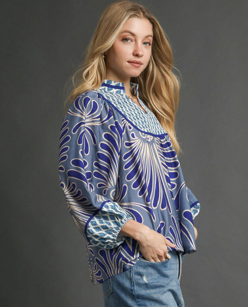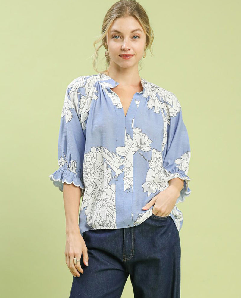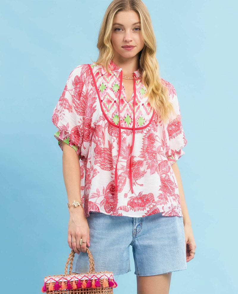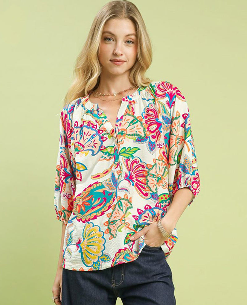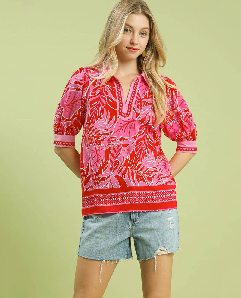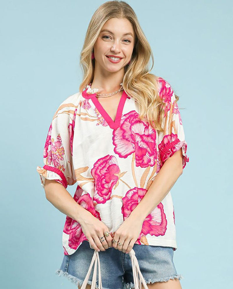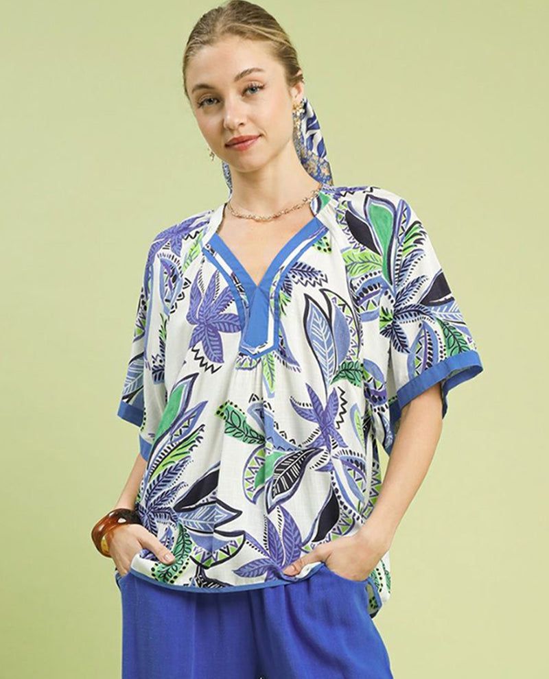 Umgee Print Top with Split V-neck and Short Relaxed Sleeves