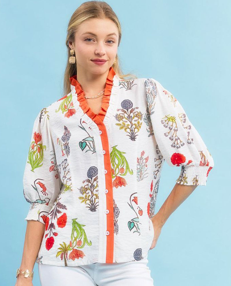 Blossom Meadow Print Top with Short Flutter Sleeves