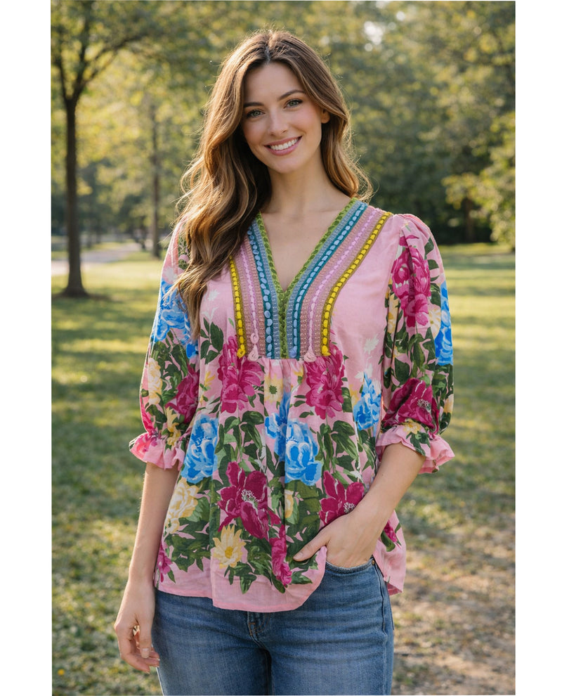 She and Sky Plus V Neck with Multi Color Patch Blouse
