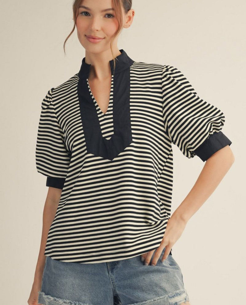 Umgee Stripe Lace Trim Pleated V-Neck Top