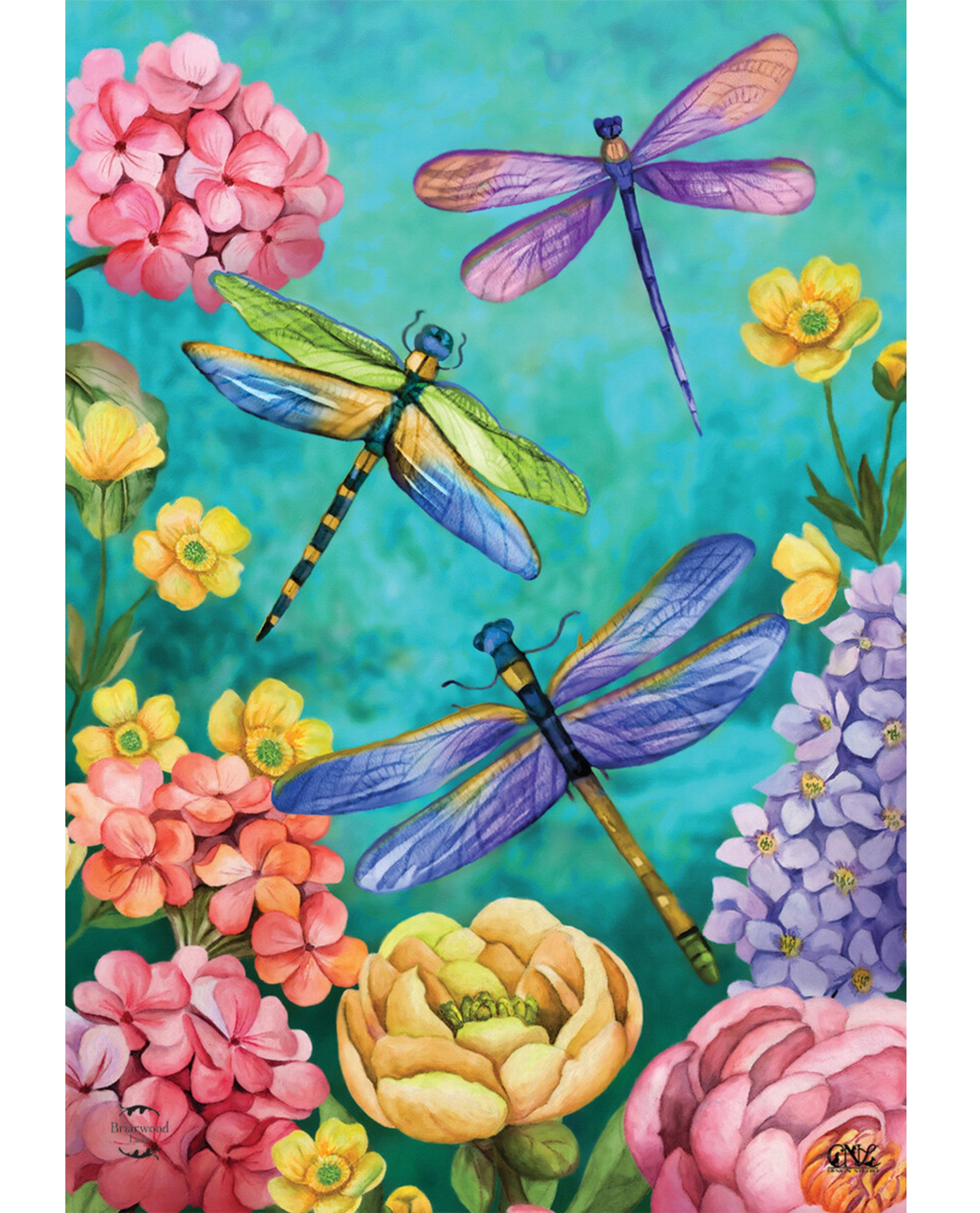 Bring your garden to life with this vibrant Dragonfly Garden Flag! Watch as three iridescent dragonflies dance around a burst of colorful blooms against a soothing blue-green backdrop. Perfect for adding a whimsical touch to your outdoor space, this cheerful flag celebrates nature's delicate beauty. Whether you're a garden enthusiast or simply love eye-catching décor, this playful design brings joy and movement to any yard or patio.