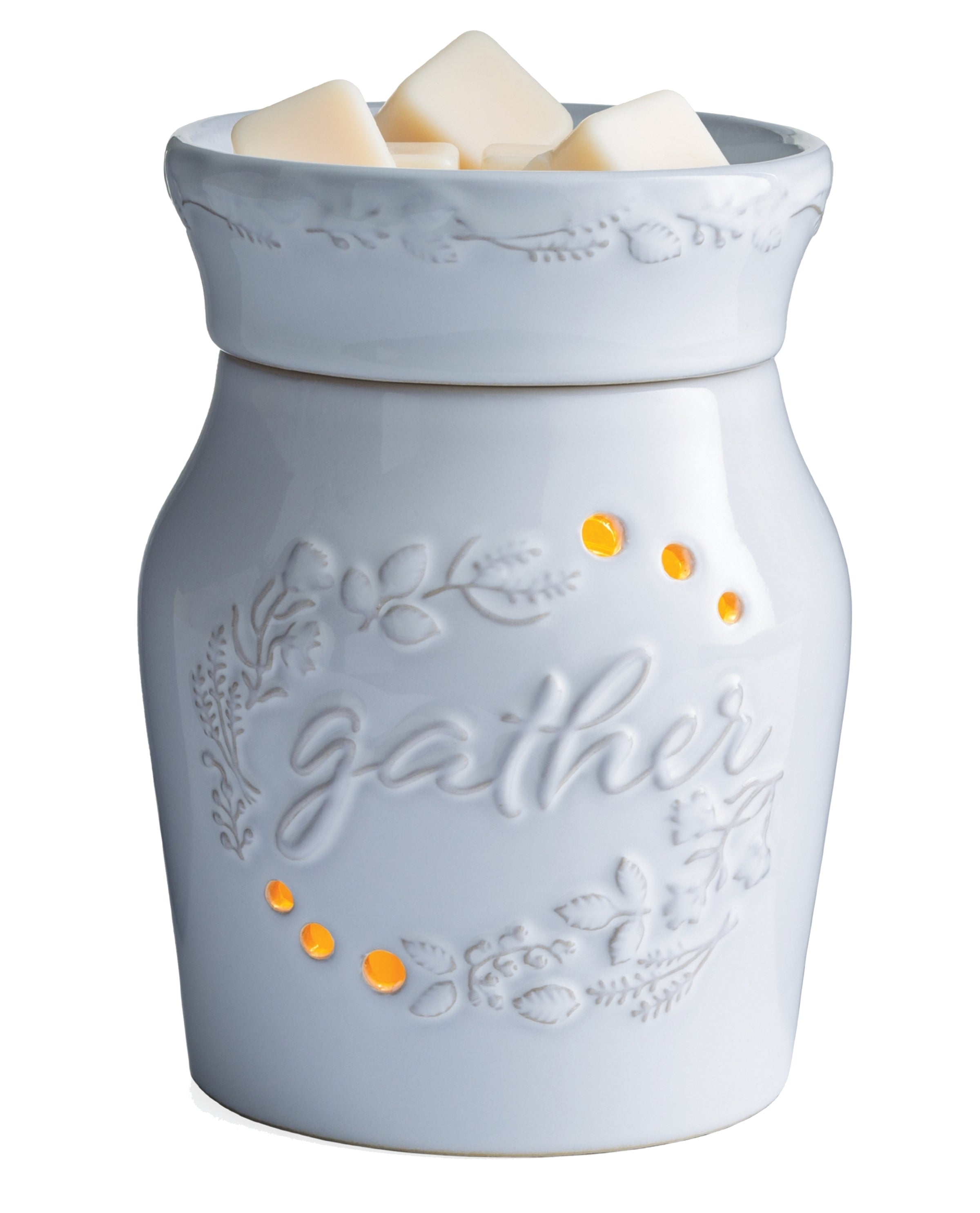 Celebrate life's meaningful moments with this charming fragrance warmer featuring a harvest botanical motif that wraps around the word "gather" in soft white glaze. A gentle reminder to cherish all the ways we come together—whether around holiday tables or in everyday gatherings. Perfect for infusing your space with warmth and welcoming fragrance while inspiring connection and togetherness.
