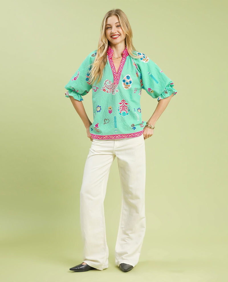 Umgee Apricot Floral Boho Top with Split Neckline and Puff Sleeves