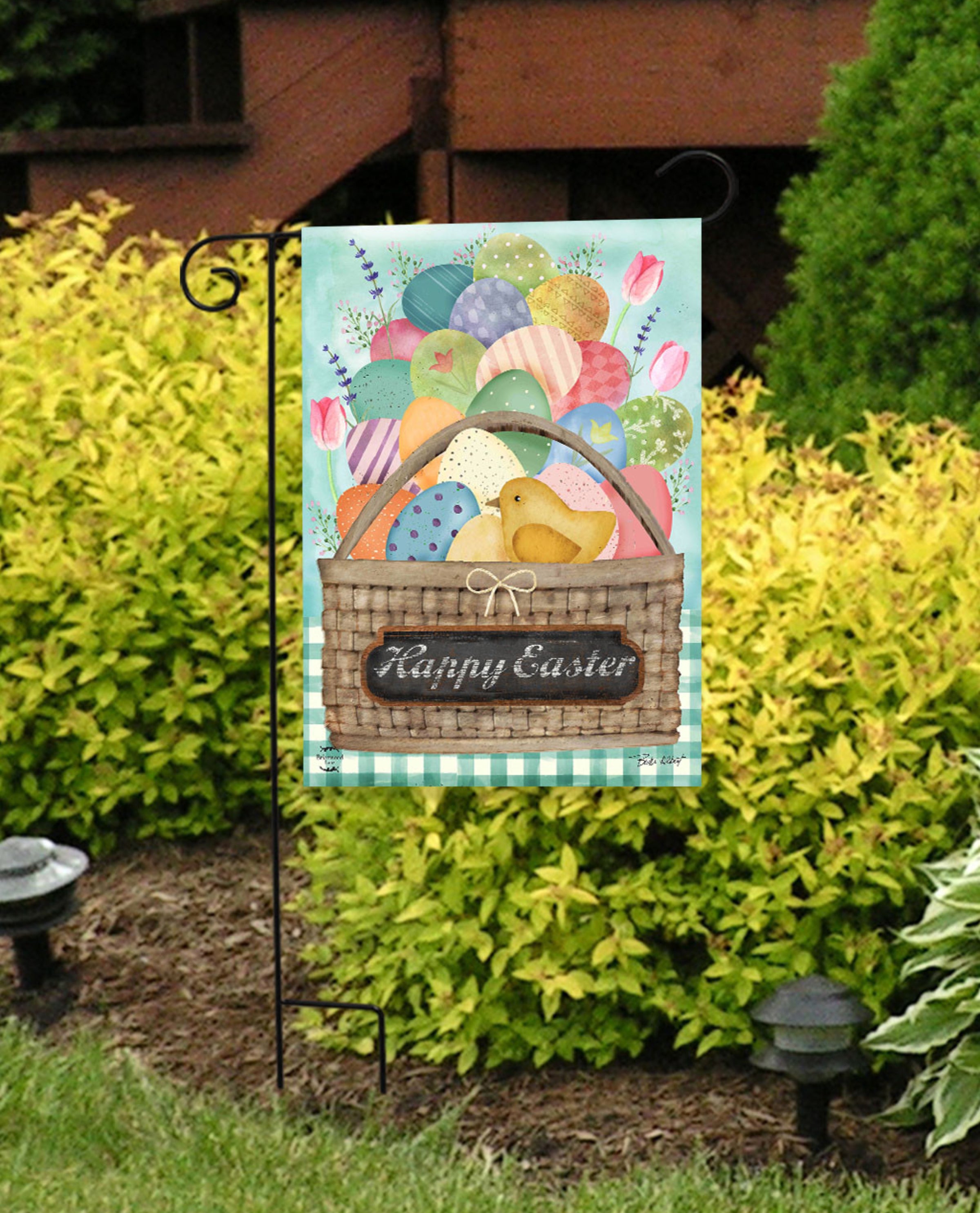 Hop into spring with this cheerful garden flag featuring a vibrant Easter basket bursting with colorful eggs and festive blooms. Perfect for welcoming the season to your yard, this playful design brings joy and whimsy to any outdoor space. Made for durability through changing weather, it's an easy way to celebrate Easter with style and charm. Let your garden bloom with holiday spirit!