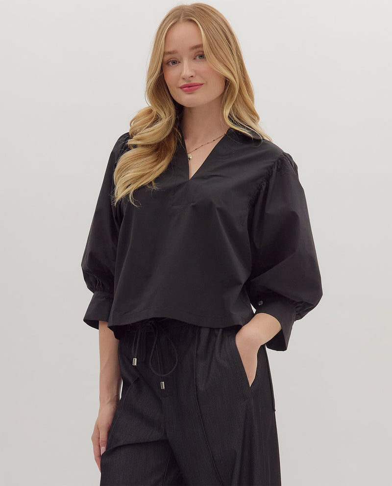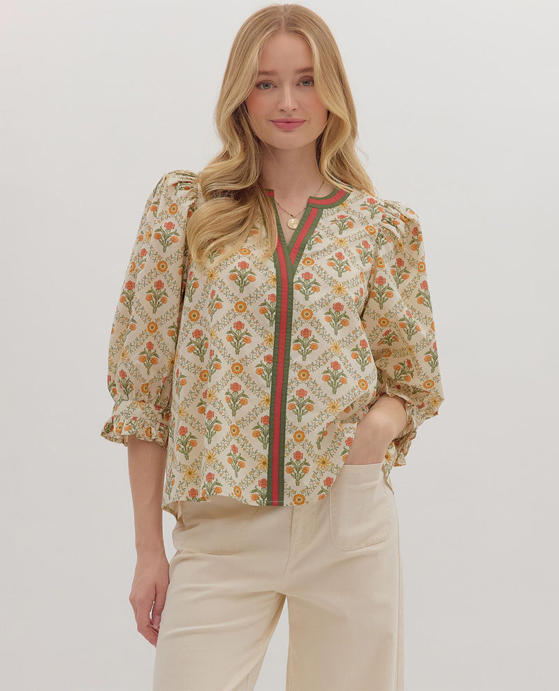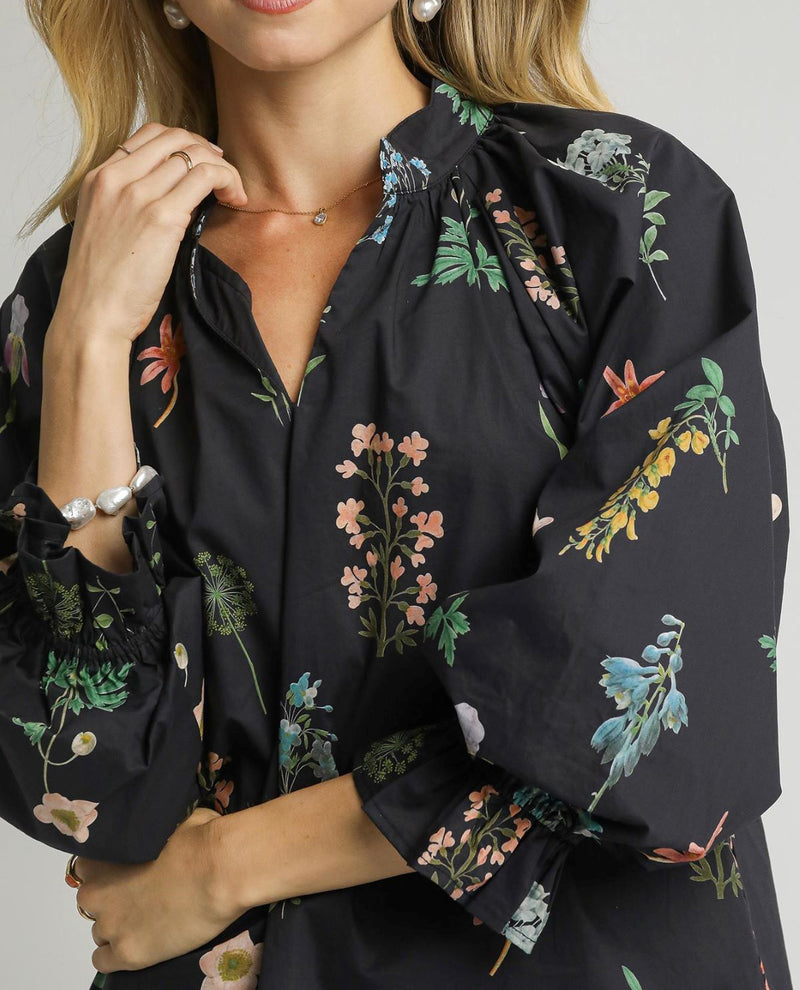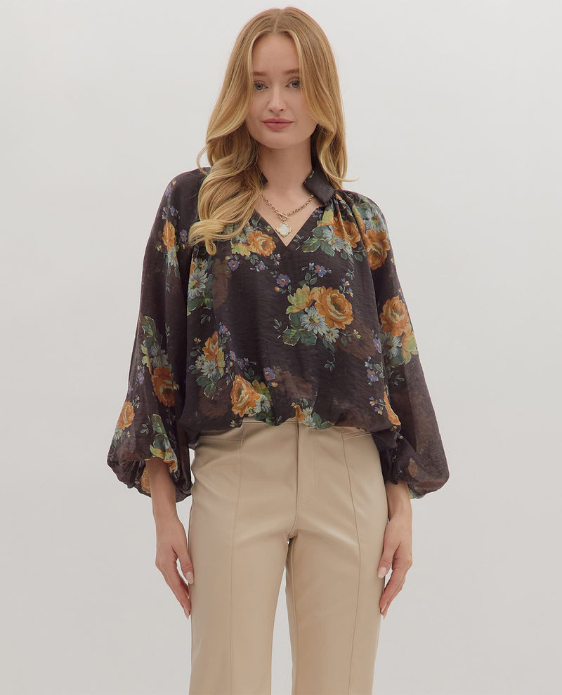 Floral Ruffle Neck Blouse with Long Balloon Sleeves