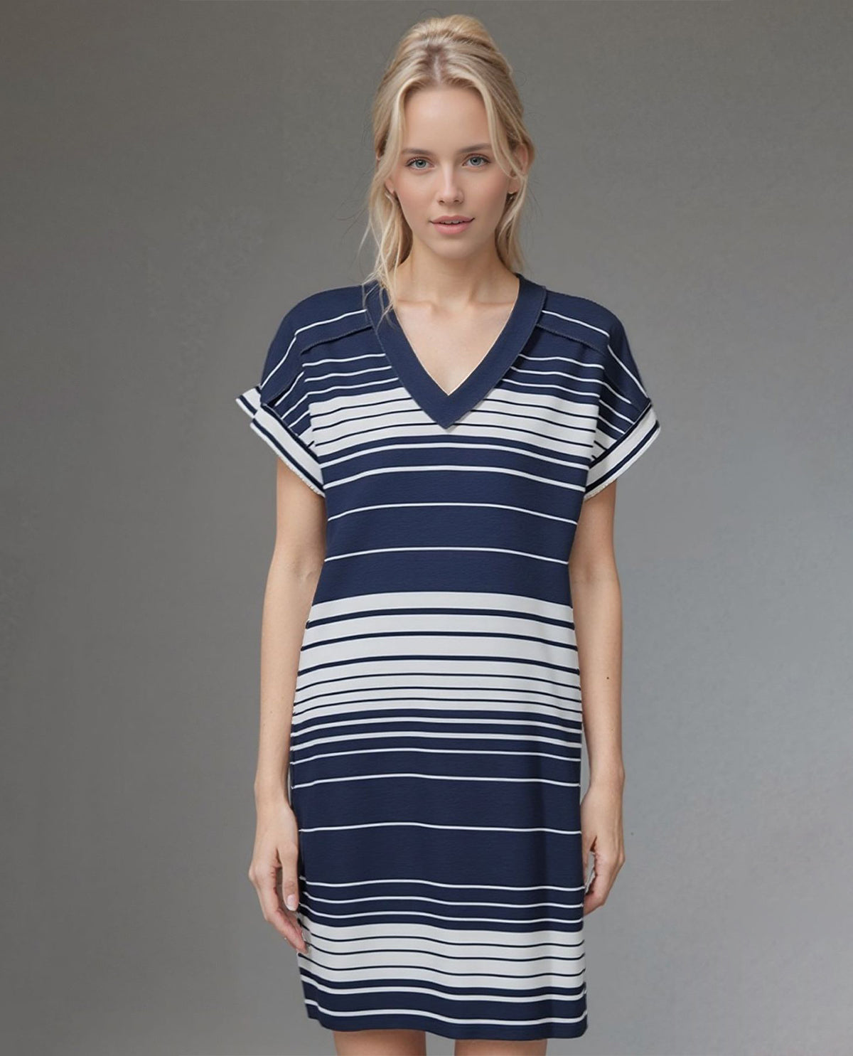 Slip into effortless style with this charming V-neck striped dress. The flattering neckline draws the eye upward while classic stripes add visual interest and versatility to your wardrobe. Perfect for casual outings or dressed up with accessories, this piece transitions seamlessly from day to night. The relaxed fit ensures comfort without sacrificing sophistication, making it a go-to favorite for any occasion.