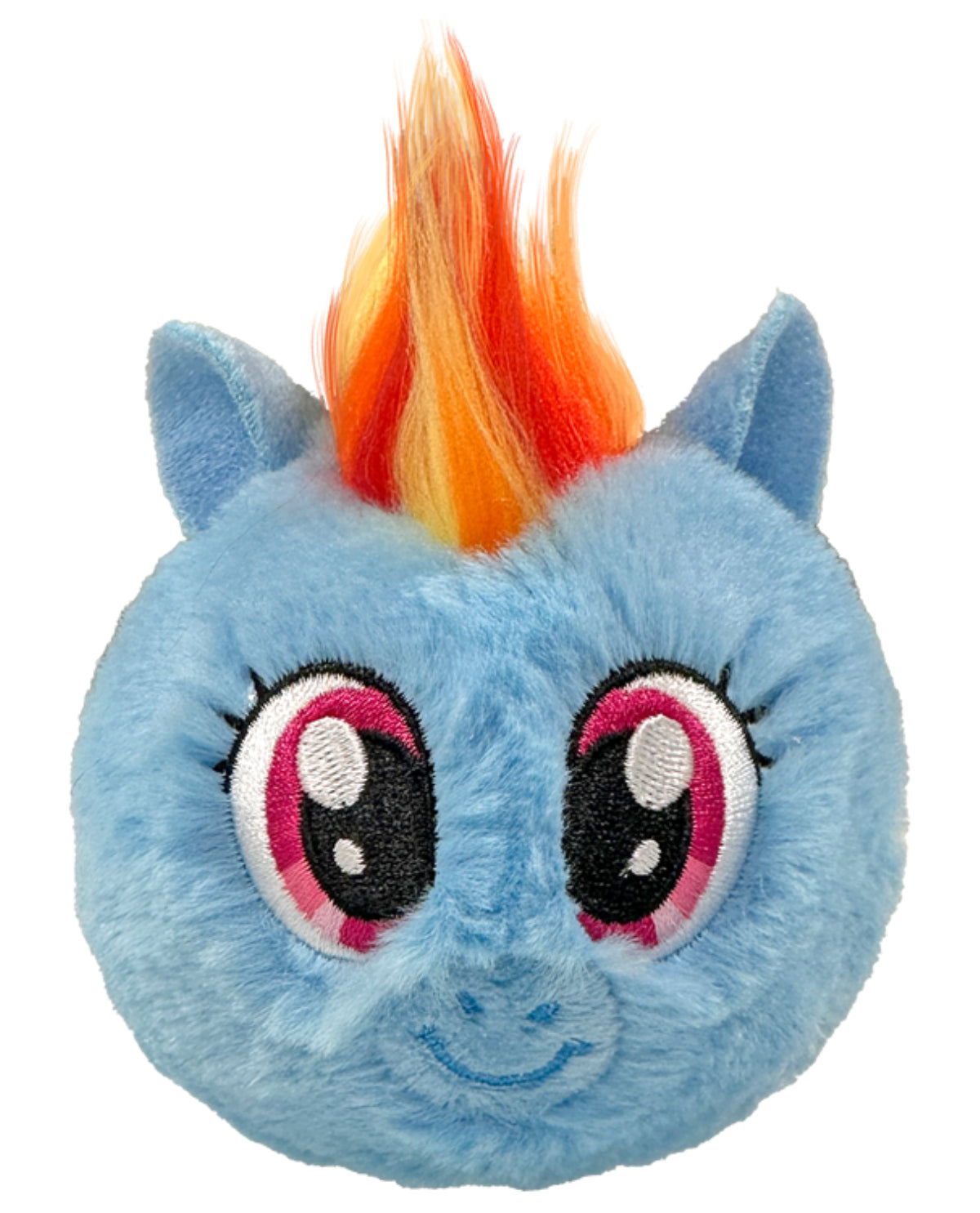 Meet Rainbow Dash, a delightful Beanie Bouncer pony from TY! This soft, round plush features a cheerful light blue body with charming embroidered details—pink eyes with lashes, a blue nose, and a smiling mouth. Topped with a vibrant mane in orange, yellow, and red, Rainbow Dash brings playful personality to any collection. Perfect for young pony fans and collectors alike, this cuddly companion is ready for imaginative adventures.