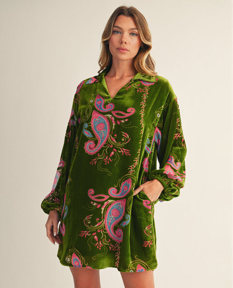 Boho Paisley Velvet Burnout Dress with Side Pockets and Ruffled Neckline