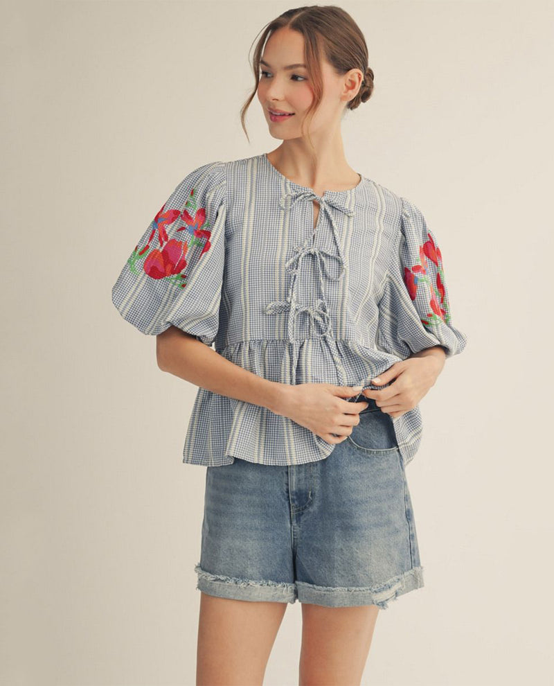 Jodifl Stripe Tie Front Top With Embroidered Sleeve Blue