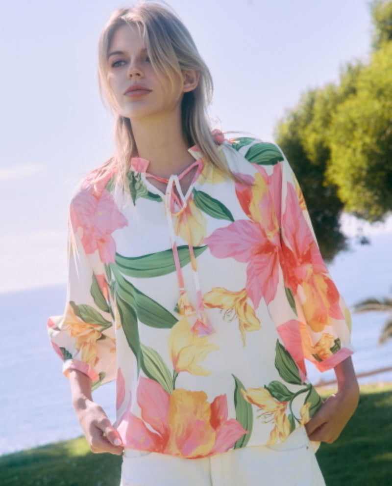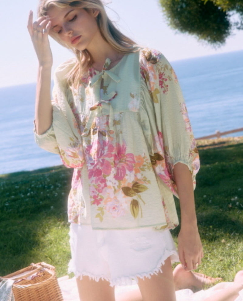 Jodifl 3/4 Puff Sleeve Color Blocked Floral Top With Front Bow Tie Detail