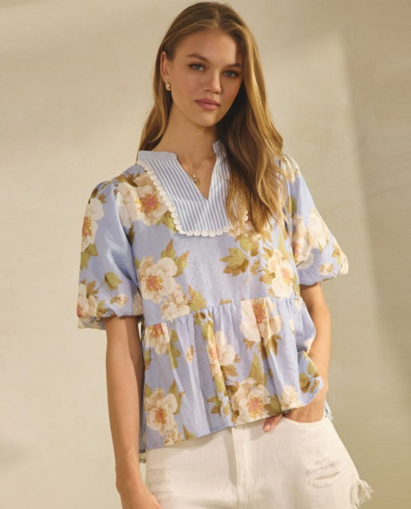 Jodifl Floral Top With Color Contrast Neckline and Ruffle Detail Sleeves