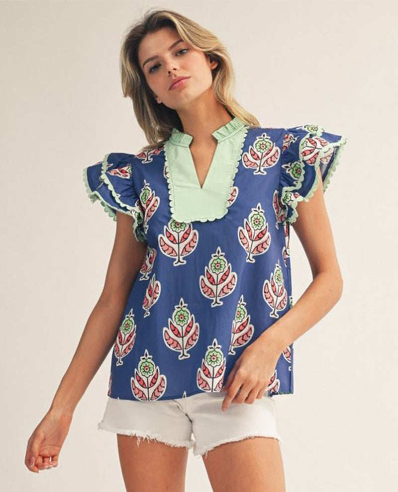 Jodifl Print Top With Flutter Sleeve and Solid Trim Blue