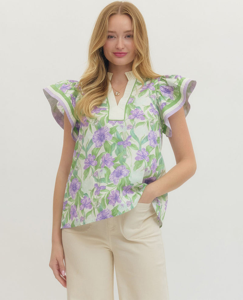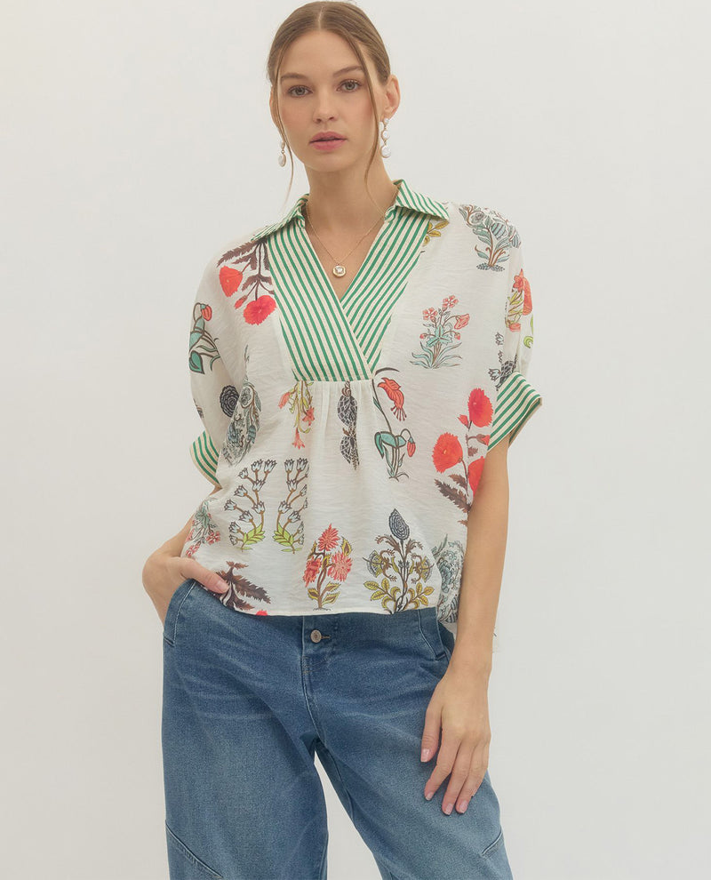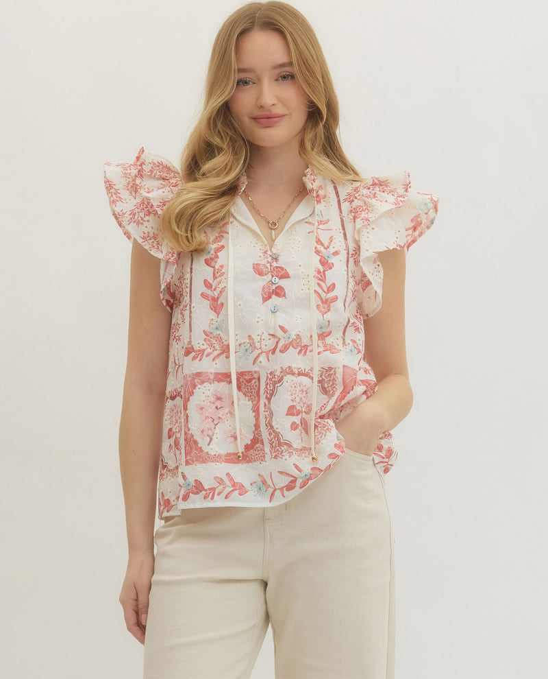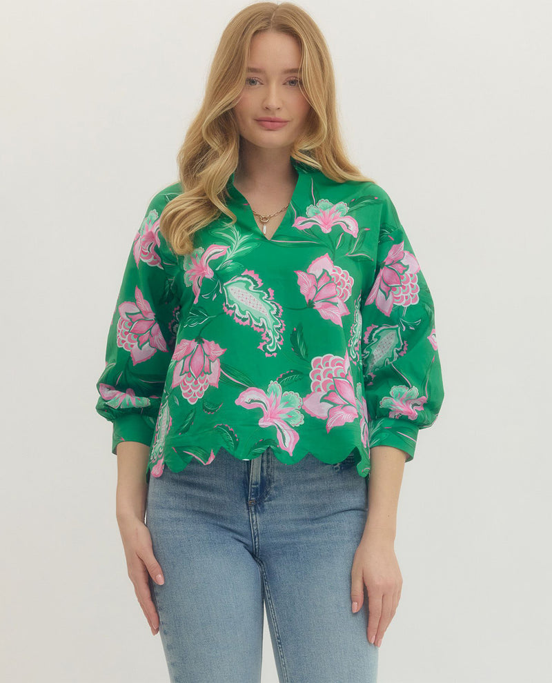 Entro Floral 3/4 Sleeve Top with Ruffle Neck