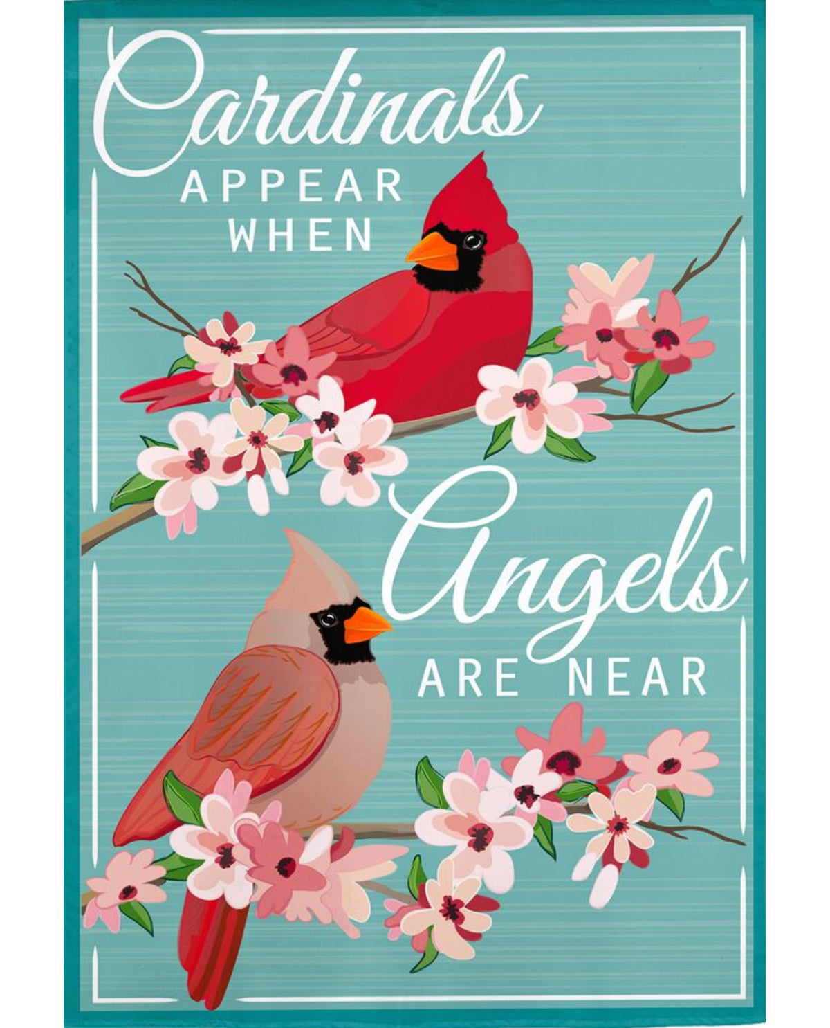 Welcome cardinals and cherished memories into your garden with this meaningful flag. Featuring two graceful cardinals perched against a serene teal background, it displays the uplifting message "Cardinals appear when angels are near." Perfect for those who find comfort in nature's symbolism, this garden flag adds warmth and spiritual significance to your outdoor space. A thoughtful way to honor loved ones and celebrate the beauty of these beloved birds.